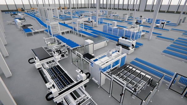 这是这家办公家具制造商新工厂的模样,计划在2022年投入使用。该三维可视化显示了其高度自动化和灵活的部件生产,其中,封边、缓存、钻孔以及铣型都是相互关联的。