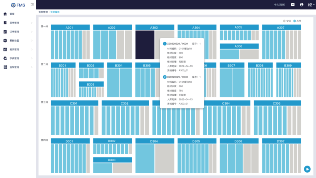根据系统运算逻辑,扫描板件的二维码,按照对应虚拟货架场景闪烁提示的合适货格位置,合理有序存放余料,便于余料二次利用。