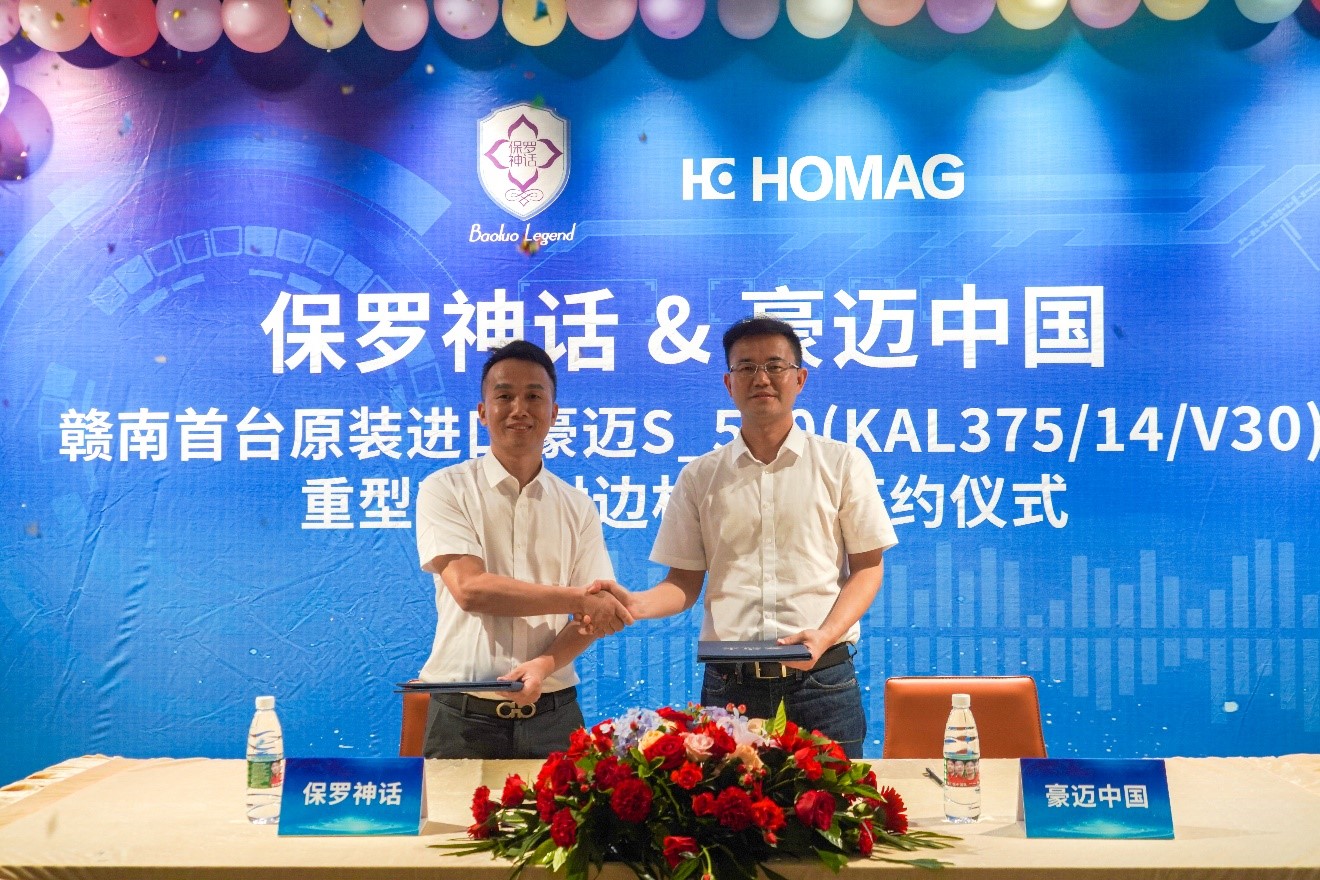 6月9日,豪迈中国与赣州保罗神话全屋定制家具(以下简称“保罗神话定制”)重型高配封边机签约仪式成功举办。保罗神话定制董事长谢庆红,豪迈中国华东区高级销售经理江九胜、江西区域销售经理吴永亮 ,爱格坪彗总经理张军及区域经理林坤出席了签约仪式。