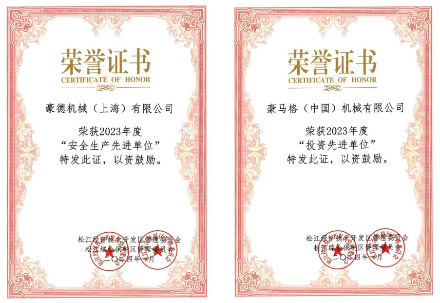 2024年1月22日,国家级松江经济技术开发区、国家级松江综合保税区长三角G60科创走廊高质量发展企业座谈会成功举办。豪迈中国旗下子公司——豪德机械(上海)有限公司荣获2023年度“安全生产先进单位”、豪马格(中国)机械有限公司荣获2023年度“投资先进单位”。