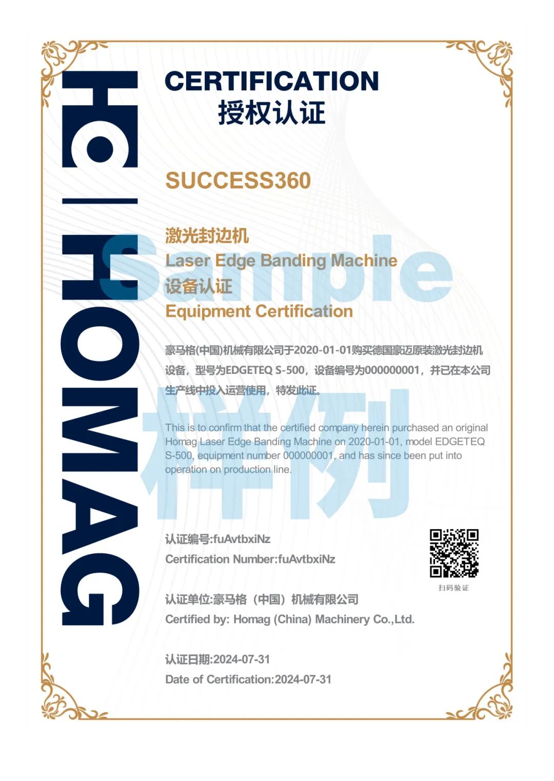 现豪迈中国将对采购豪迈原装激光封边设备的客户进行认证,颁发相关认证证明,践行豪迈中国Success360 - 客户长效价值计划。